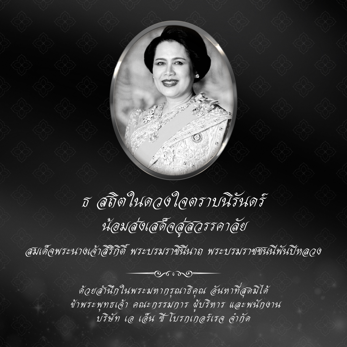 น้อมแสดงความอาลัยและรำลึกในพระมหากรุณาธิคุณเป็นล้นพ้นอันหาที่สุดมิได้ ขอถวายความเคารพและน้อมส่งเสด็จสู่สวรรคาลัย ข้าพระพุทธเจ้า คณะผู้บริหาร และพนักงาน บริษัท เอ เอ็น ซี โบรกเกอร์เรจ จำกัด ๒๔ ตุลาคม ๒๕๖๘